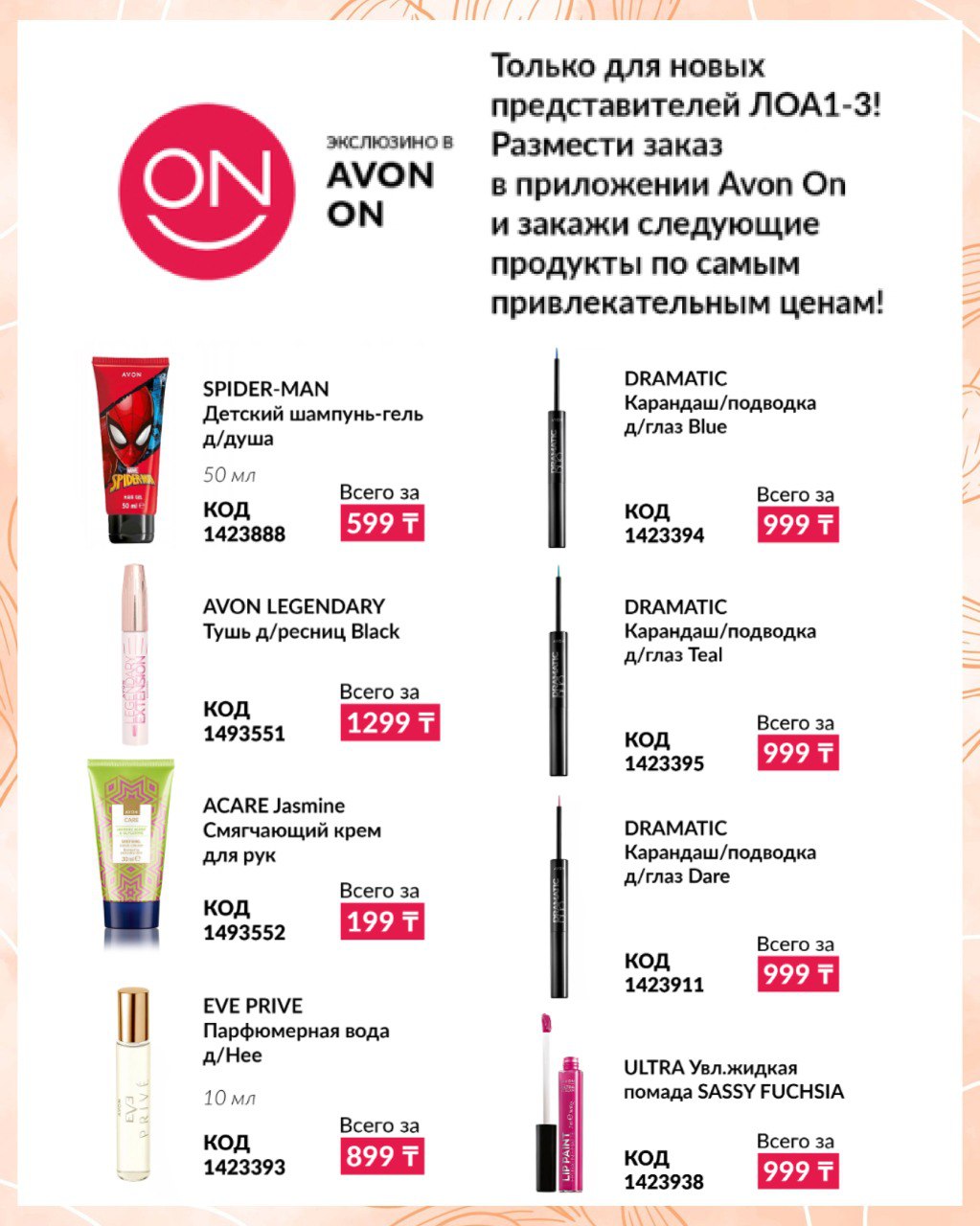 Если ты новый Представитель ЛОА 1-3, размести заказ в приложении AVON ON и воспользуйся возможностью заказать продукты со скидкой до 80%
